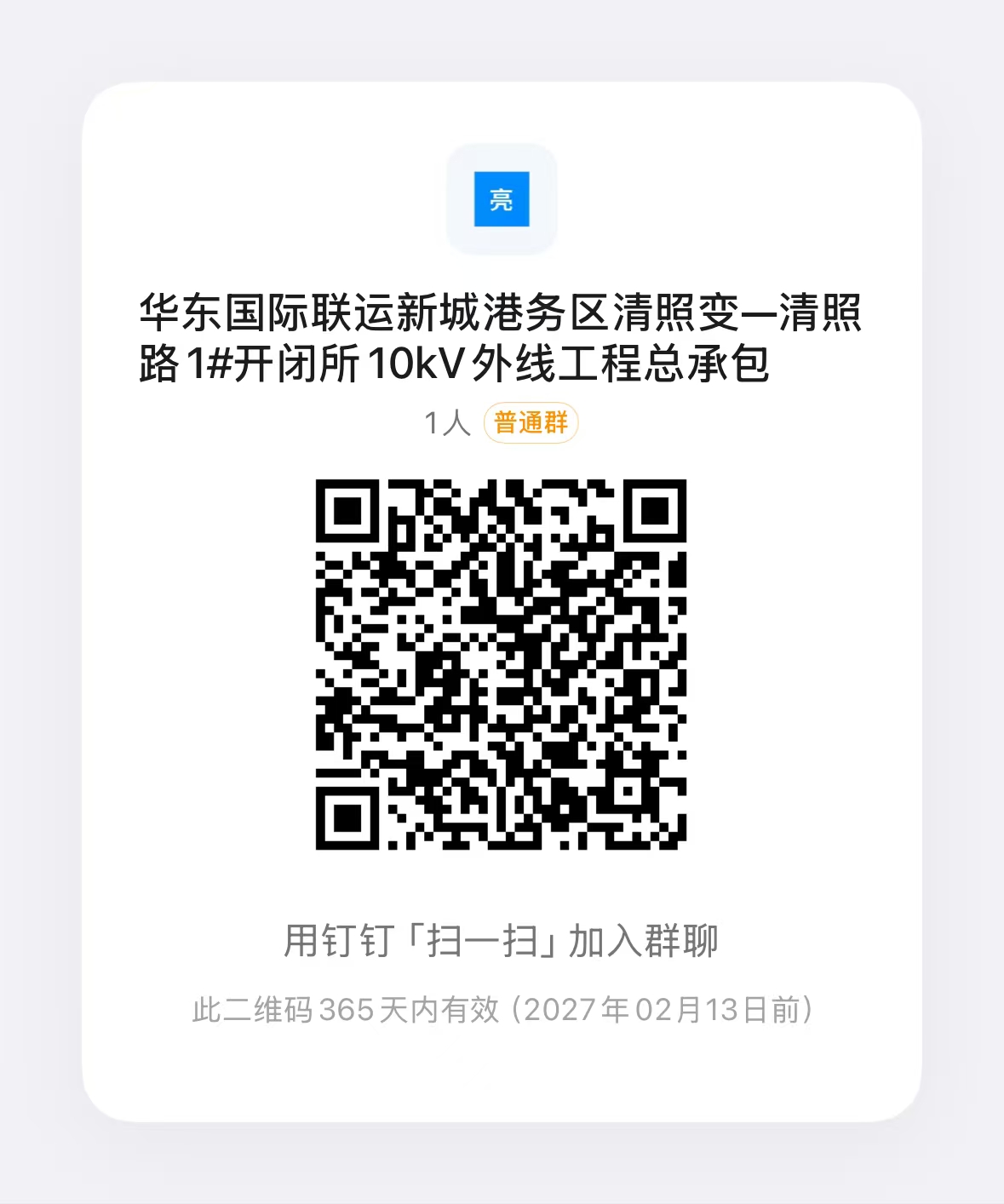 5.5開標時間前30分鐘,投標人應使用釘釘軟件掃描下方二維碼進入開標直播群,開標全過程將在釘釘群中進行直播(“華東國際聯運新城港務區清照變—清照路1#開閉所10kV外線工程總承包”群的釘釘群號: 160160018192)。“華東國際聯運新城港務區清照變—清照路1#開閉所10kV外線工程總承包”群的二維碼如下: